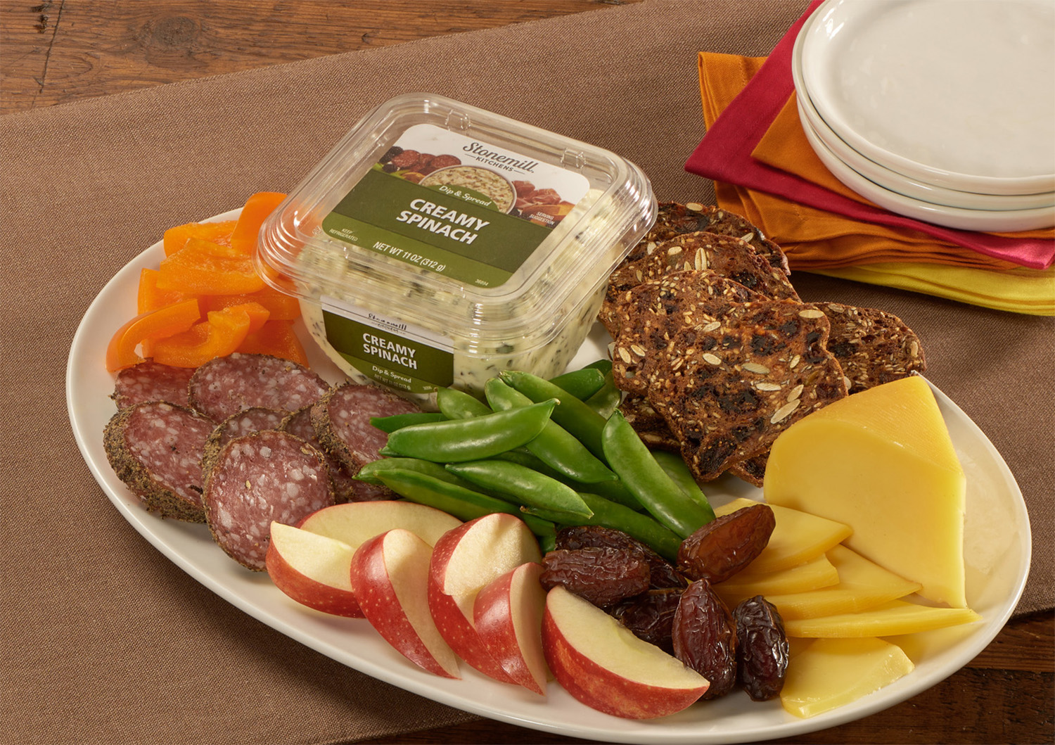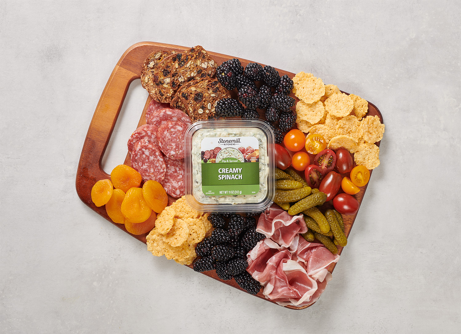 MAYONNAISE (SOYBEAN OIL, WATER, EGG YOLKS, VINEGAR, SALT), SPINACH, WATER CHESTNUTS (WATER CHESTNUTS, WATER, CITRIC ACID), SOUR CREAM (PASTEURIZED CULTURED CREAM [MILK], NON-FAT MILK POWDER, ENZYMES), WATER, GREEN ONION, MODIFIED CORN STARCH, DEHYDRATED ONION, NATURAL FLAVOR, CARROTS, CULTURED DEXTROSE TO PROTECT FLAVOR, SALT, DEHYDRATED TOASTED ONION, DEHYDRATED CABBAGE, SUGAR, GRANULATED GARLIC, PEAS, RED BELL PEPPER, XANTHAN GUM, NATAMYCIN AS AN ANTIMICROBIAL.